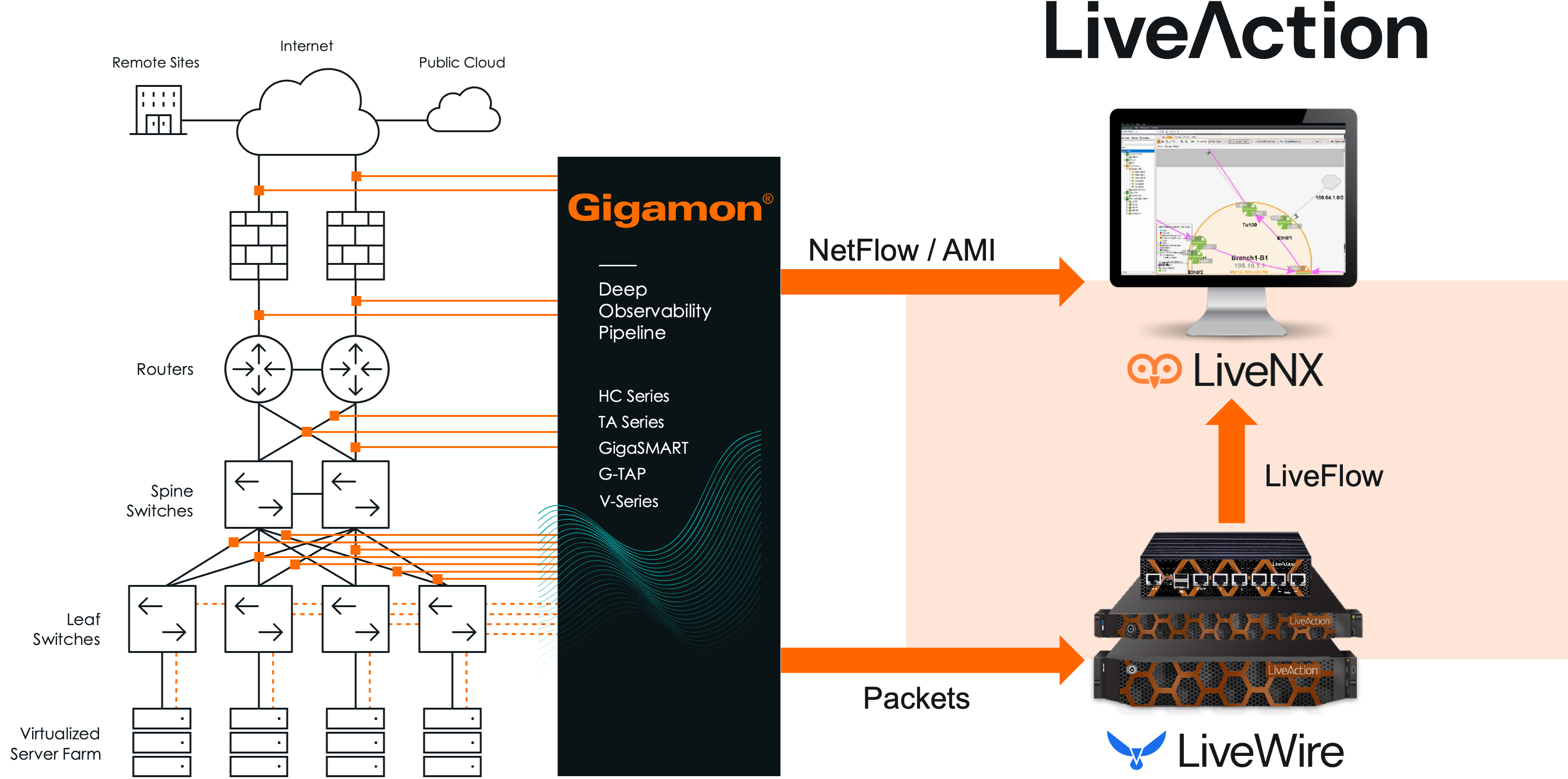 The Gigamon Deep Observability Pipeline provides LiveAction LiveWire with network traffic as packets and continual NetFlow/metadata records to LiveNX. Network traffic from TAP and SPAN ports are sent to the Gigamon Deep Observability Pipeline. The user specifies which traffic to monitor, and the Gigamon Deep Observability Pipeline passes packets and generates Application Metadata Intelligence (AMI) in the form of IPFIX which LiveAction can analyze.