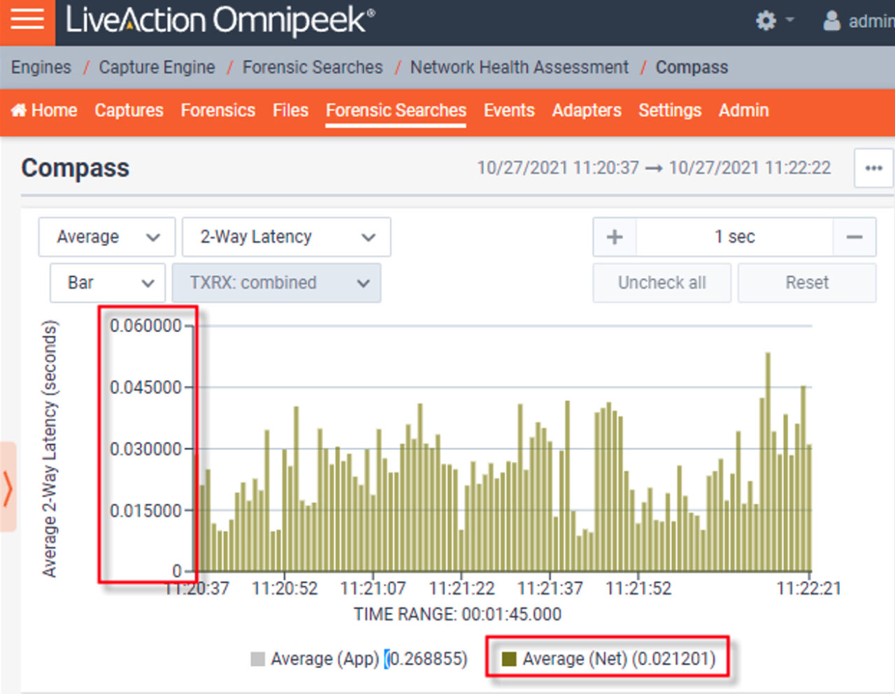 Once the forensic search is done, click on the name, and the various analysis views will appear on the left. Select Compass from the list, and change the pulldown in the upper left of Compass to “2-way Latency”. The graph in Compass will show the application and network latency as separate data series over time.