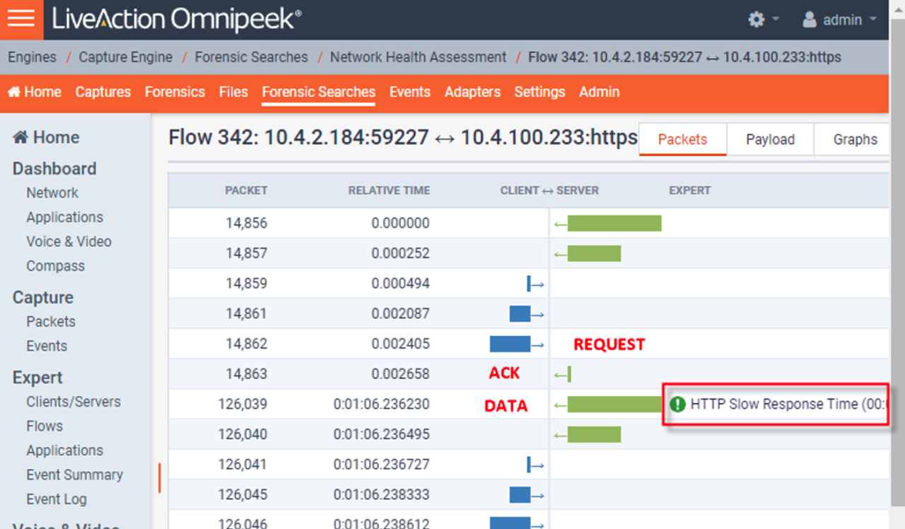 There are many signs of a healthy network, and one of the most important is low response times. High or long response times is a sign of an unhealthy network. Response times can be determined by capturing the traffic and measuring the time it takes for a client request to return a response from the server. There are two types of responses. One is a network response, or ACK, and the other is the application response, or data from the application. When a request goes out, the server will respond with an ACK as soon as it receives the request. The application response will be returned when the application is done processing the request and returns some data. An example of these transactions is shown below in the LiveWire Flow Visualizer. On the right, LiveWire has flagged the transaction as an HTTP Slow Response Time.