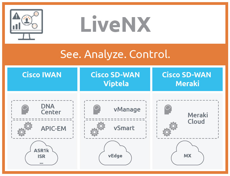 Whether it’s Cisco IWAN, Cisco SD-WAN Viptela, or Cisco SD-WAN Meraki, LiveNX has deep integrations to bridge visibility silos in your SD-WAN integration.